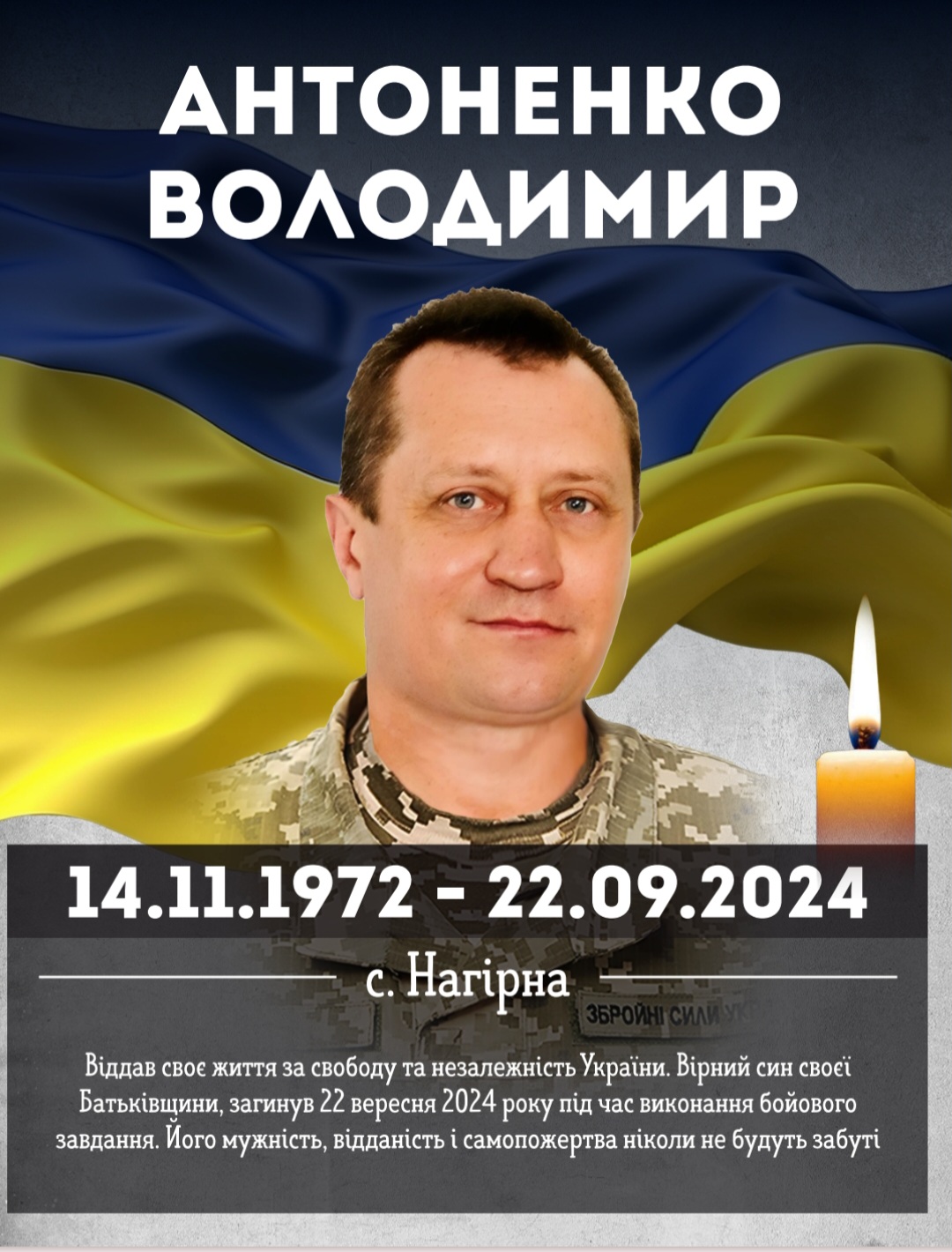 14.11.1972-22.09.2024 Володимир Антоненко народився 14 листопада 1972 року в с. Любарка Бориспільського району , що на Київщині. До села Нагірна переїхав 1996 році.Працював у господарстві “Прогрес”, робітником на млині, в олійній, згодом- оператором газових котелень,